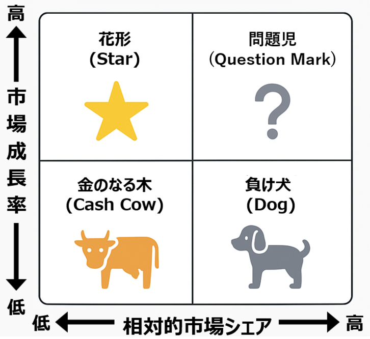 | 問題児 (Question Mark) | 高い | 低い | 成長市場だがシェアが低い事業。多額の投資を行って「花形」に育てるか、将来性が見込めなければ撤退・売却するか、戦略的な見極めが必要。 |
